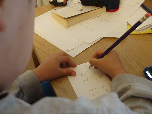 MABO:「その紙じゃなくって、こっちの紙に書いてみる?」 (まっさらな紙を渡す)